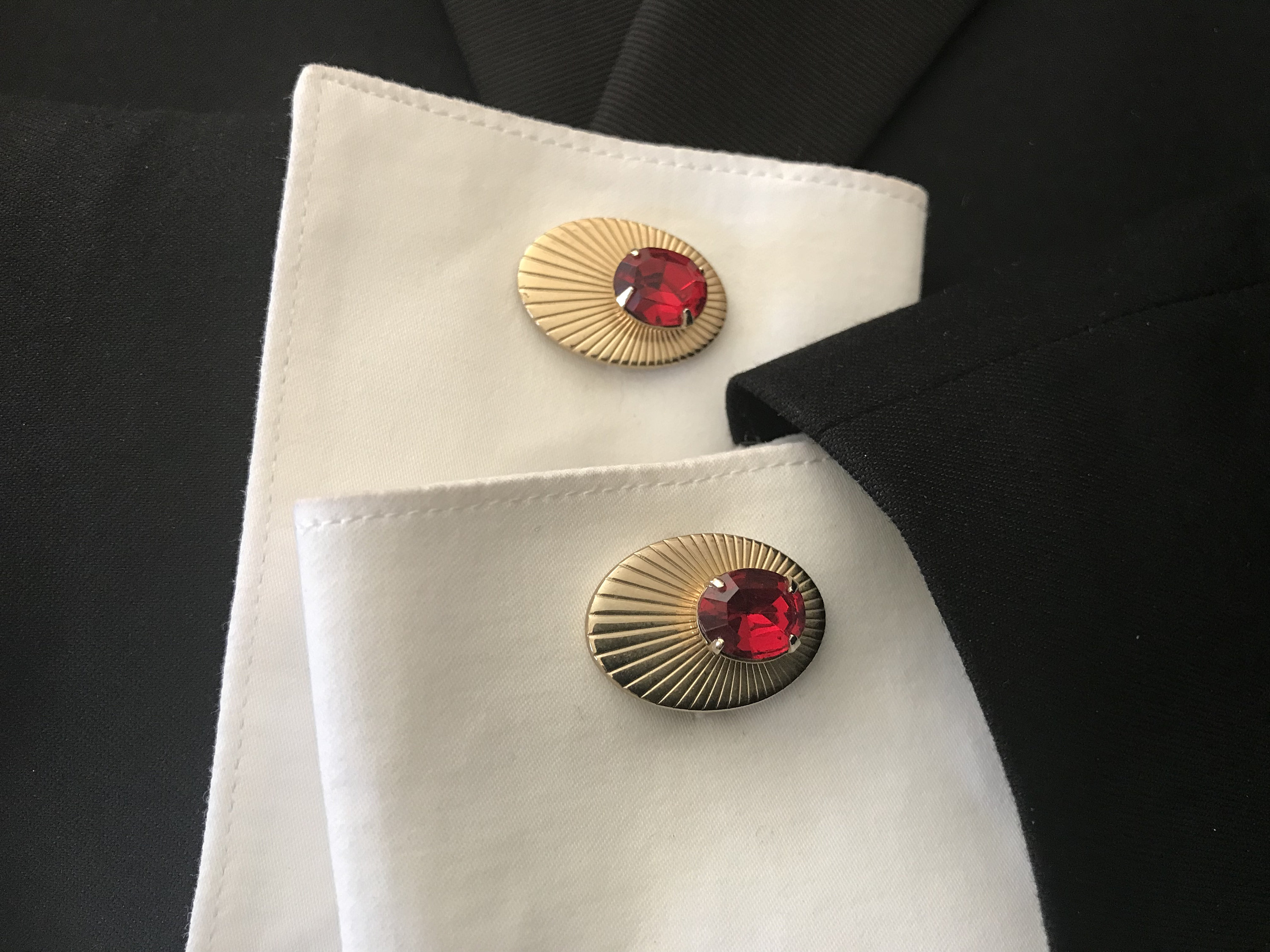 Calling all the Stylish Smooth Operators! Land this handsome vintage set of Cufflinks. They have a deep red center rhinestone on a gold-tone oval shaped setting and feature a inset ray pattern. This is a classic design that will look exceptional with formal attire. They are well made and signed by the manufacturer, Shields.