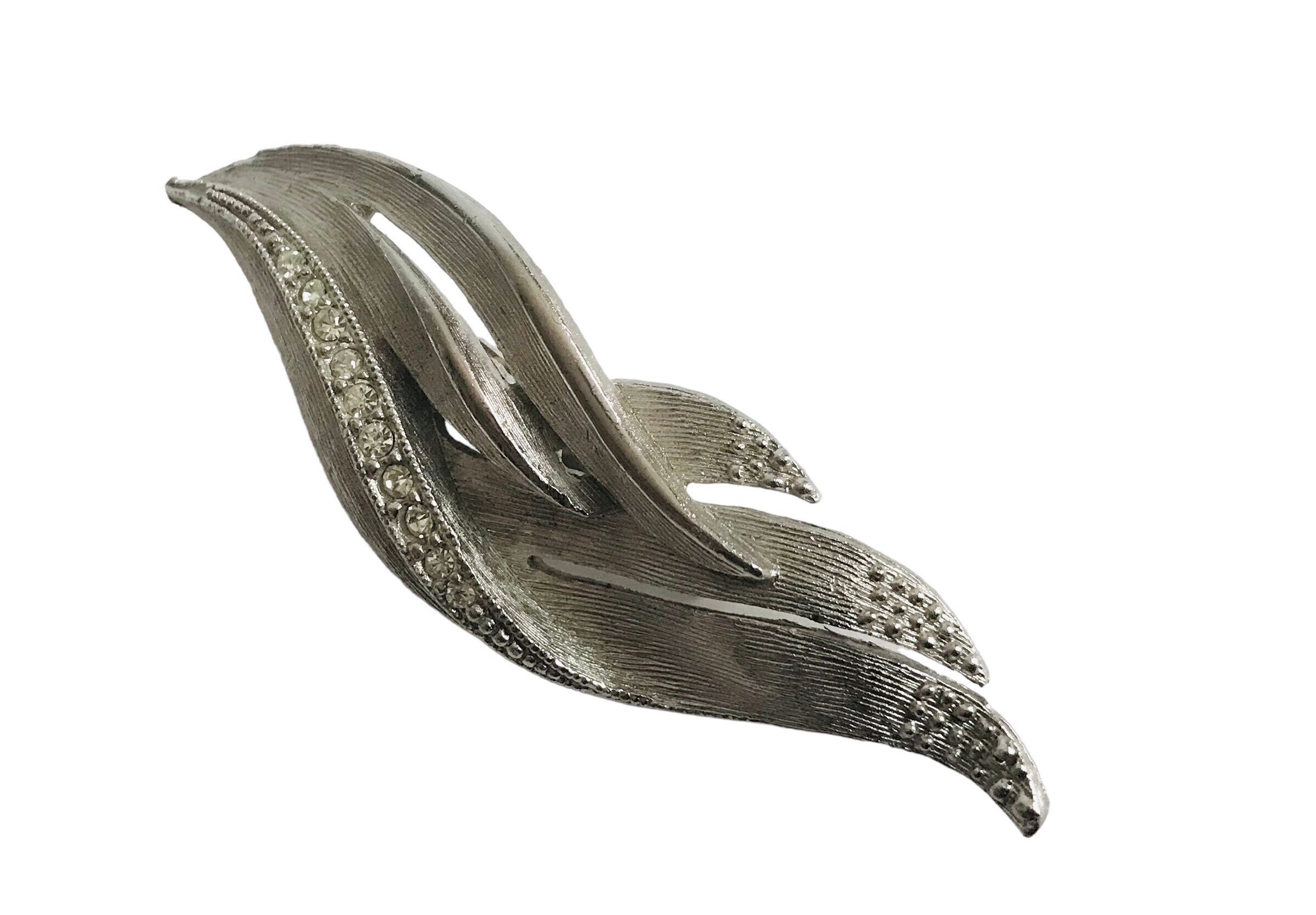 Silvertone Leaf Vintage Brooch, Mid Century Florentine Finish Brooch Pin, Rhinestone Accents, Retro Swirl Pin, Classic Design Lapel Hat Pin