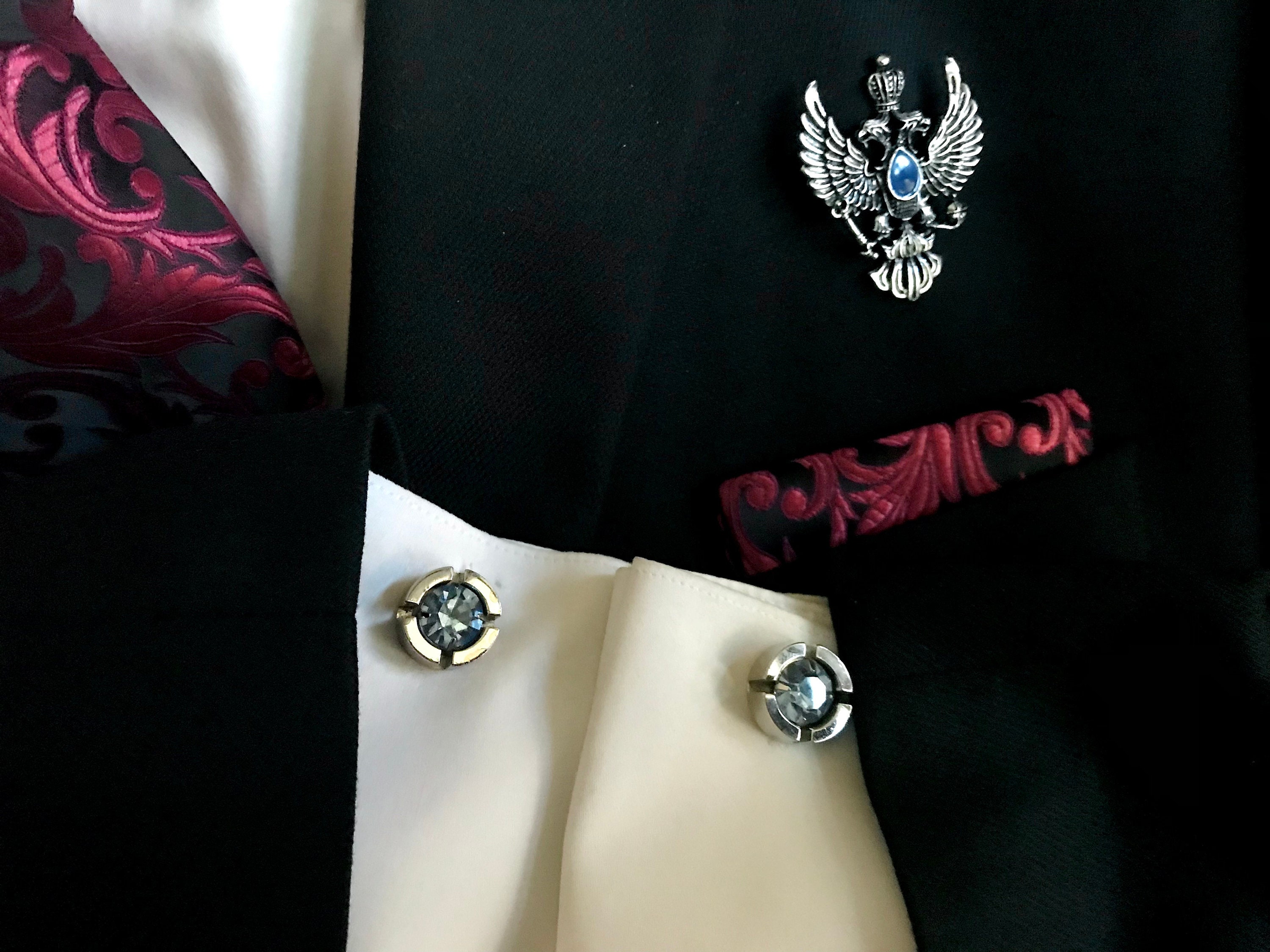 Wear this imperial designed pin on your blazer or your hat to add a touch of nobility to your fine fashion. It features a silver-tone double-headed eagle with extended wings wearing a royal crown with a scepter and a globus cruciger or an orb and cross in hand. The body of the eagle is embellished with a dark blue (acrylic) accent.